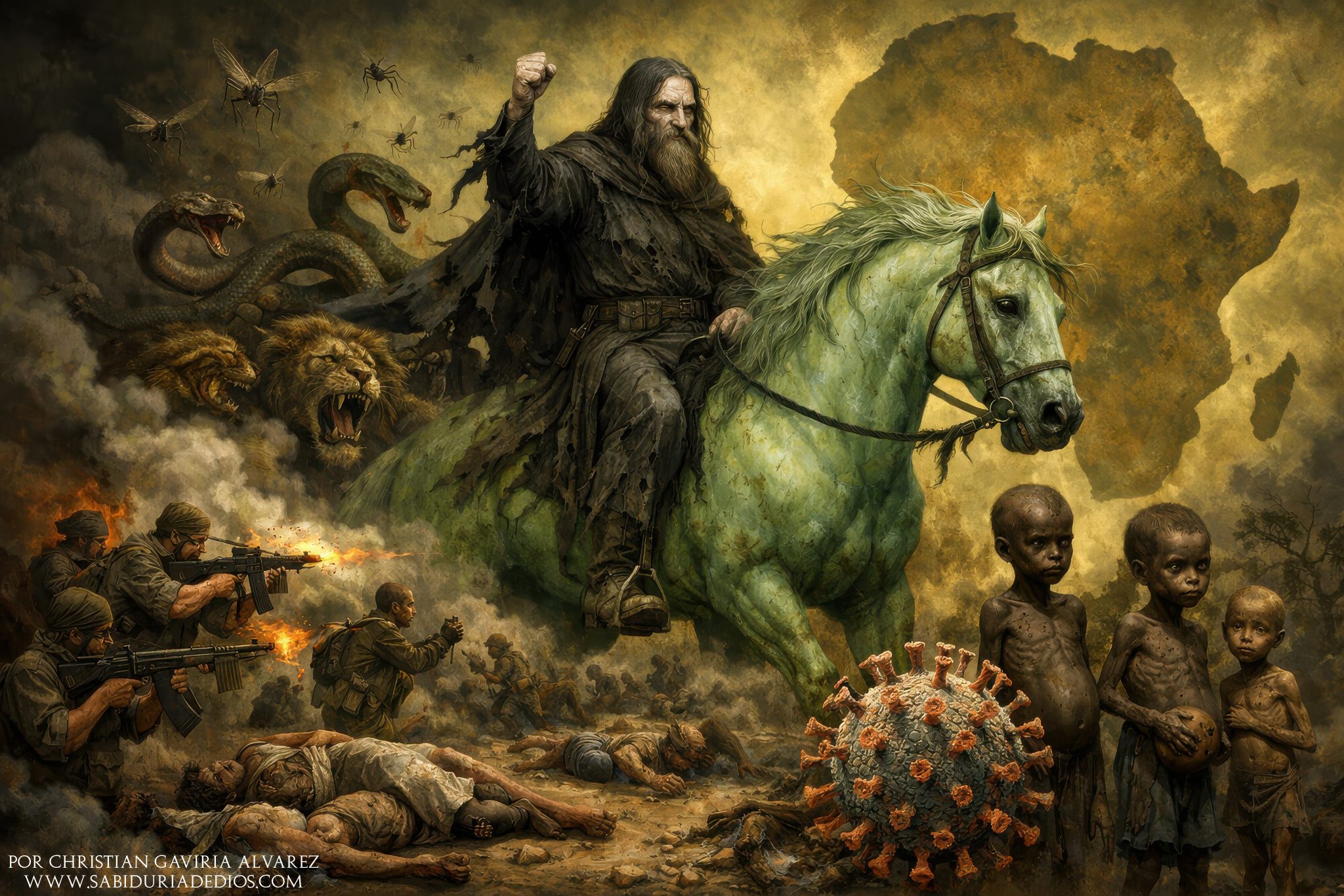El quinto ángel tocó la trompeta, y vi una estrella que había caído del cielo a la tierra, y se le dio la llave del pozo del abismo. Cuando abrió el pozo del abismo,subió humo del pozo como el humo de un gran horno, y el sol y el aire se oscurecieron por el humo del pozo. Y del humo salieron langostas sobre la tierra, y se les dio poder como tienen poder los escorpiones de la tierra… Y les fue dado que no los mataran, sino que los atormentaran cinco meses. Y su tormento era como tormento de escorpión… Tienen sobre ellos por rey al ángel del abismo, cuyo nombre en hebreo es Abadón, y en griego se llama Apolión.