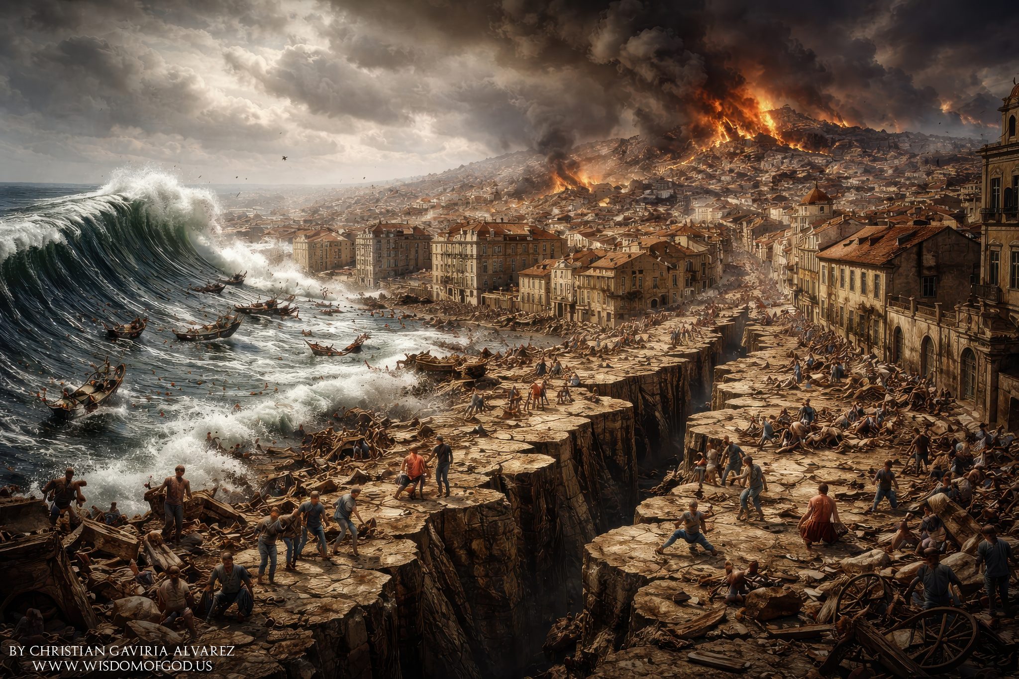 Nota: Traducido en español. También, esto es meramente una referencia a una obra externa para ayudar a establecer las enseñanzas hechas aquí, y no un respaldo de otras obras o enseñanzas hechas por este publicador y/o autor. También, los detalles exactos dados en esta cita en referencia a este terremoto pueden o no ser exactos, pero nos dan una idea de que tan destructivo fue este terremoto, que así cumplió el “gran terremoto” mencionado en el sexto sello del Apocalipsis.