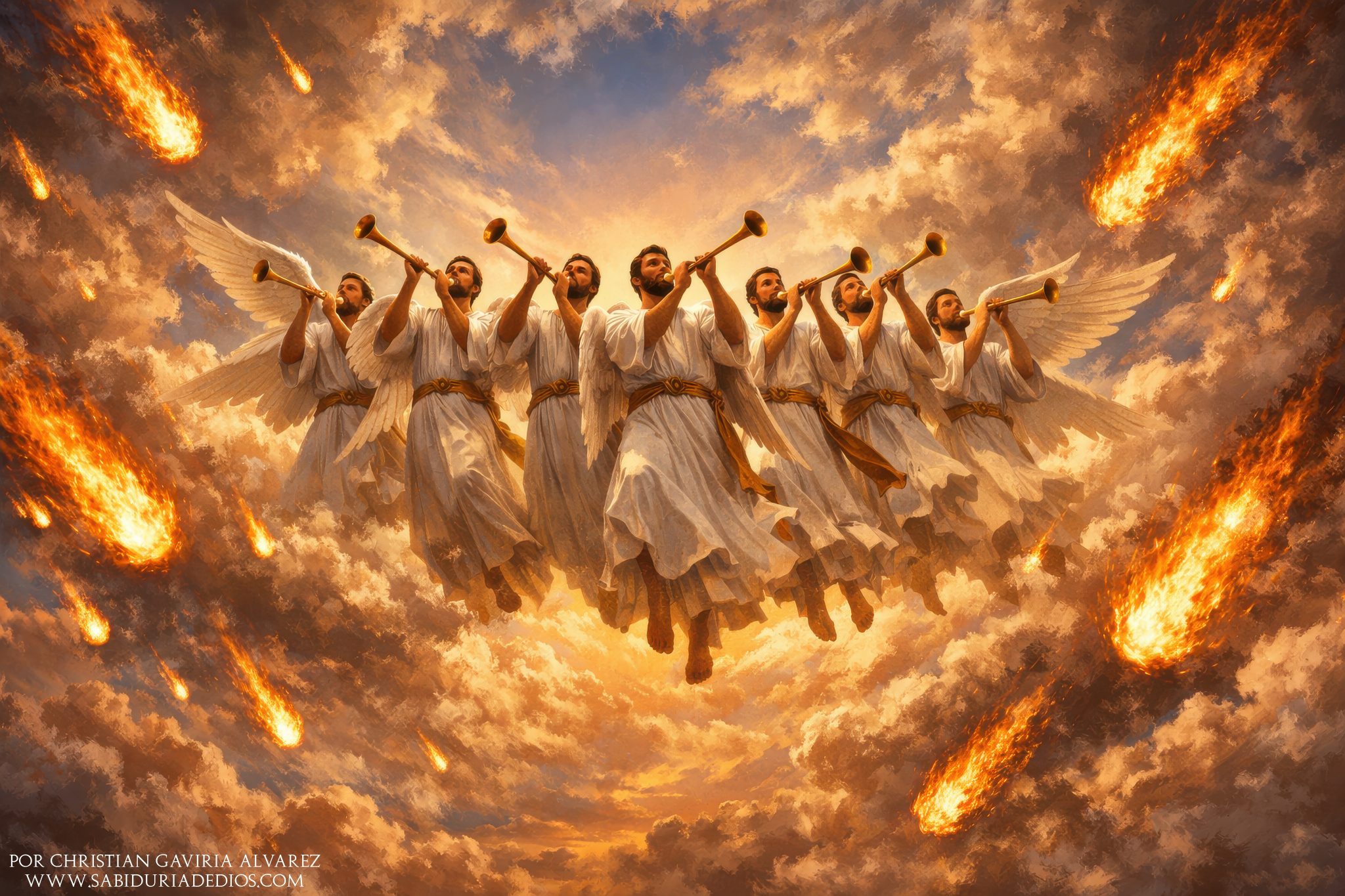 Cuando el Cordero abrió el séptimo sello, hubo silencio en el cielo como por media hora. Y vi a los siete ángeles que están de pie delante de Dios, y se les dieron siete trompetas.